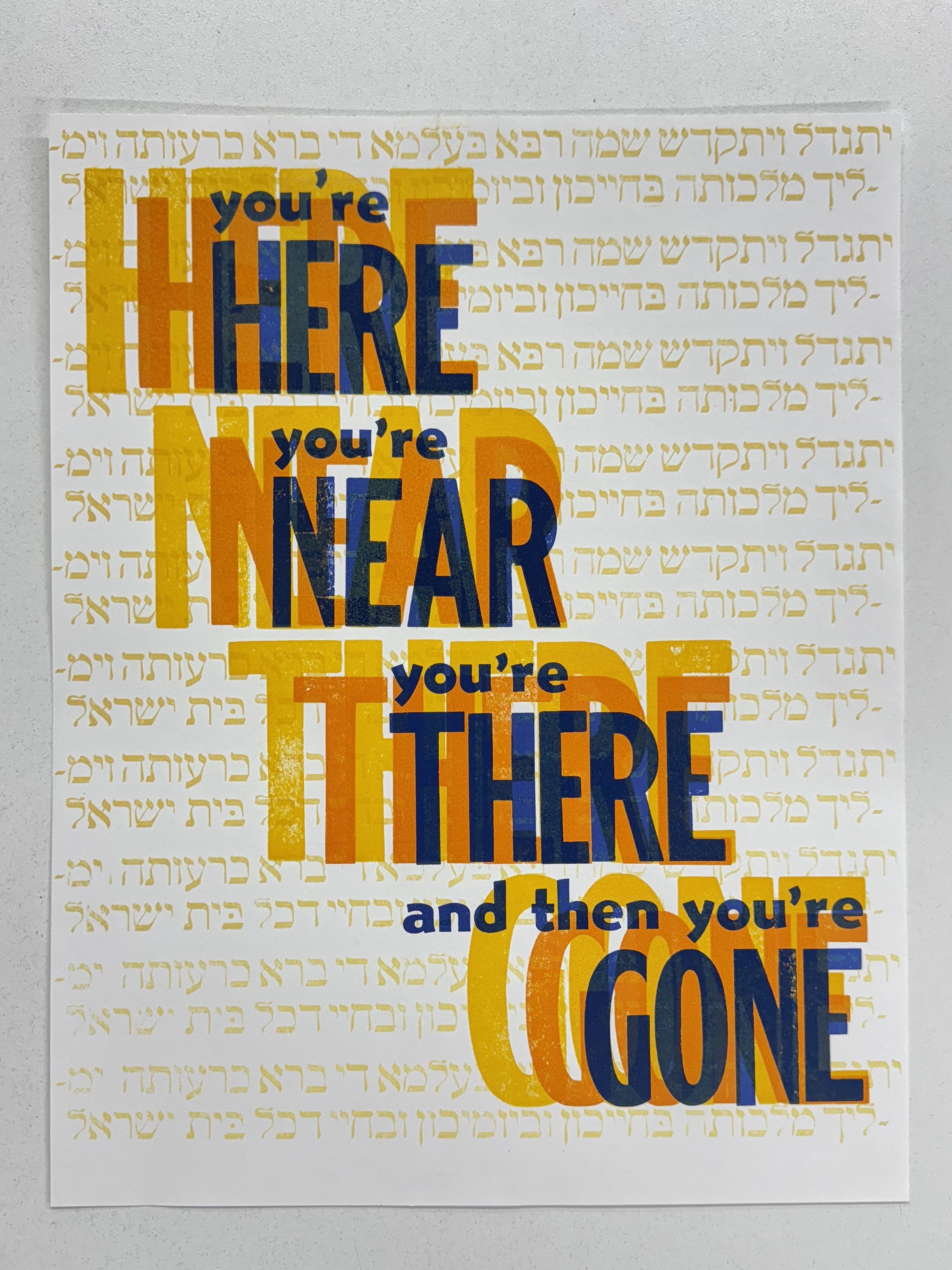 The text in the background is the first two lines of the Kaddish Yatom (Mourner’s Kaddish), fading away as it repeats down the page. The blessing, interestingly, does not mention death at all and instead focuses on exalting God and calling for peace. Some mourners struggle with this because, on first pass, it seems inexplicably unrelated to the reason we’re saying the prayer in the first place, but rabbinic explanations note (among other reasons) that it reminds us that our own life’s work to improve the world must continue.